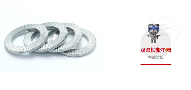 特點(diǎn):雙疊鎖緊墊圈適用于振動劇烈的場合,通過楔形防松原理,可以起到有效的防松作用。